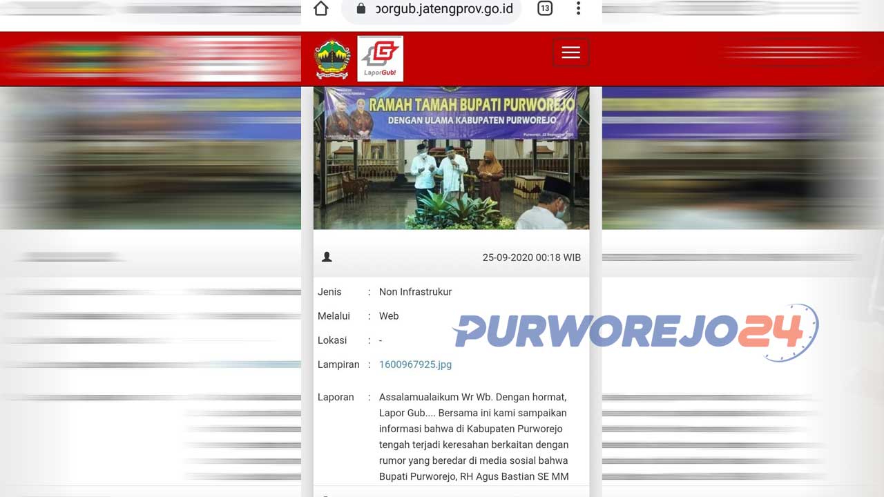 “Assalamualaikum Wr Wb. Dengan hormat, Lapor Gub…. Bersama ini kami sampaikan informasi bahwa di Kabupaten Purworejo tengah terjadi keresahan berkaitan dengan rumor yang beredar di media sosial bahwa Bupati Purworejo, RH Agus Bastian SE MM saat ini sedang menjalani perawatan di RSA UGM setelah sebelumnya menjalani isolasi mandiri di rumah dinas. Informasi yang beredar, beliau terpapar setelah melakukan perjalanan dari Jakarta, dan hasil swab keluar pada tanggal 16 September tanggal 17 September kontrol ke RSA UGM kemudian melakukan isolasi mandiri di rumah dinas bupati.
